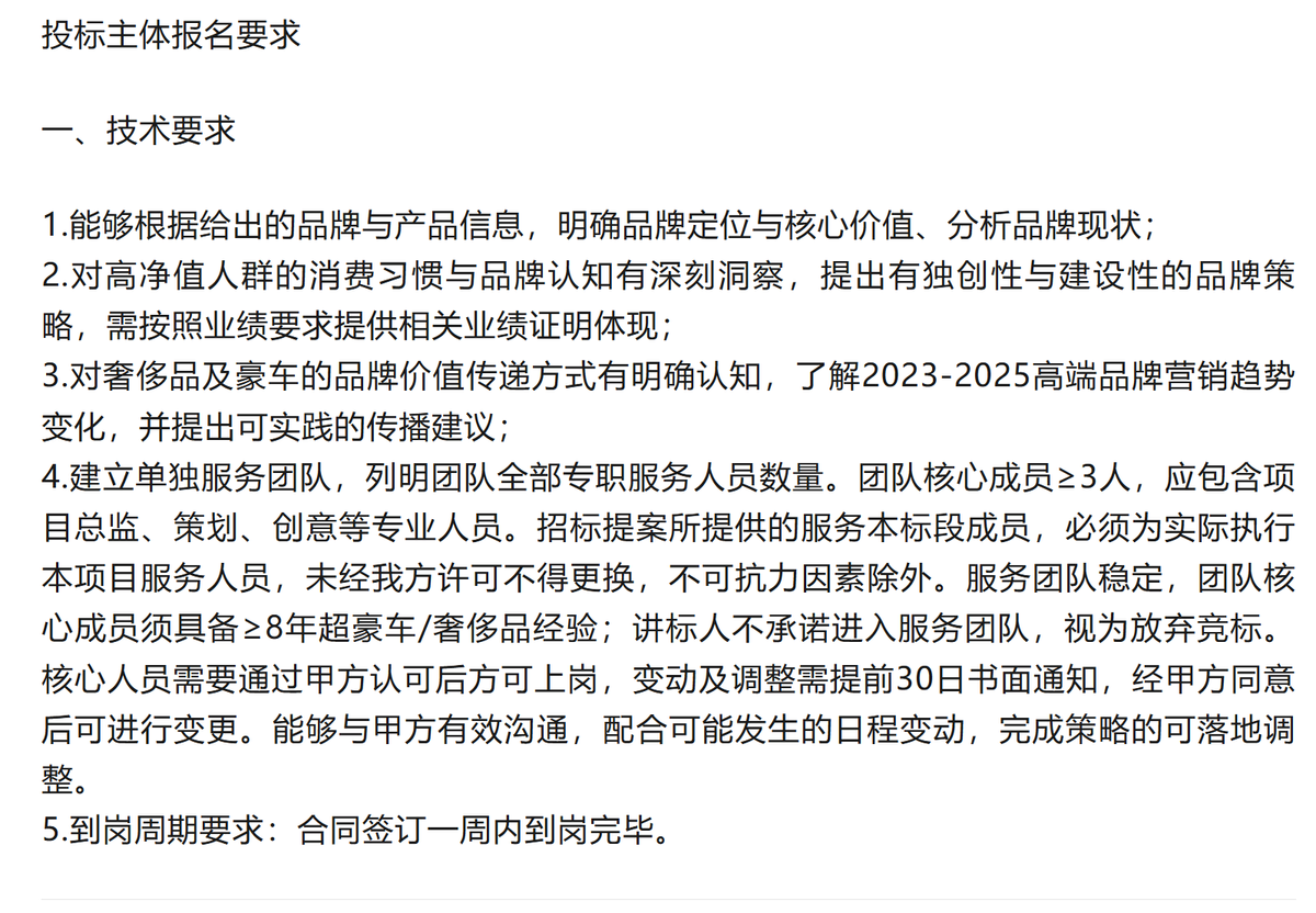 比如,招标要求策略服务供应商需有全球奢侈品牌价值前50强品牌如LVMH、爱马仕、普拉达级别的,或劳斯莱斯、法拉利、兰博基尼等知名超豪汽车品牌的操盘经验。