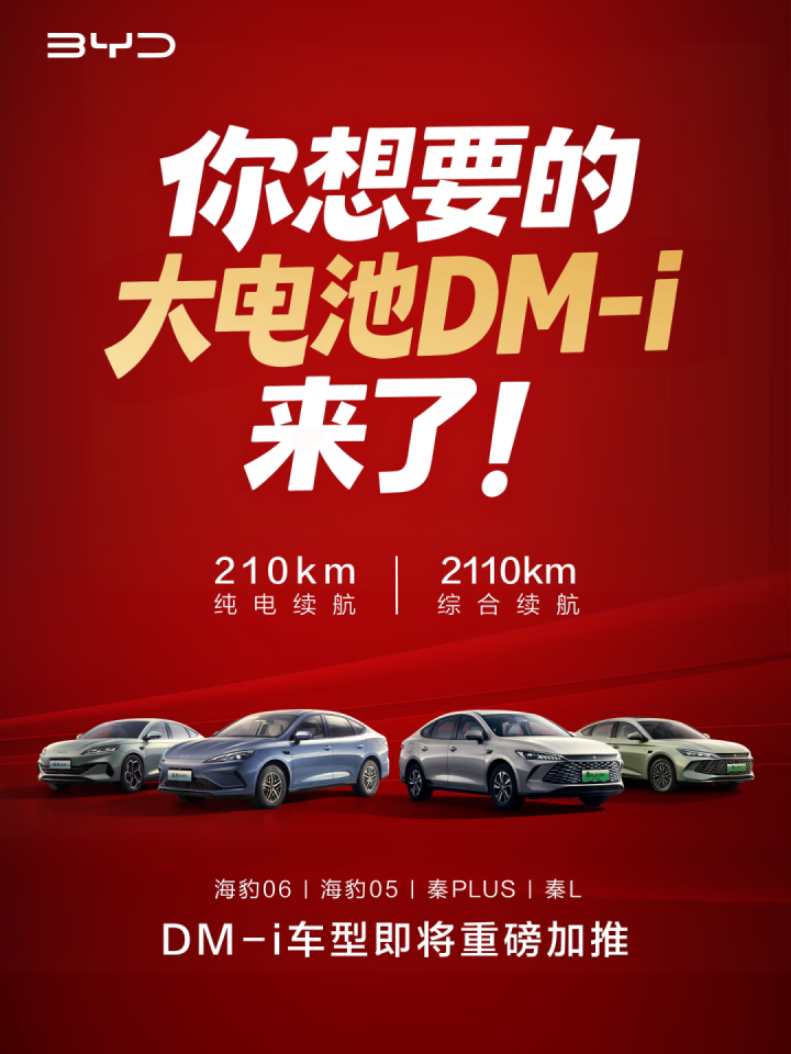 比亚迪发布预热海报,将针对秦PLUS DM-i等四款车型,加推纯电续航210km、综合续航 2110km 的大电池版本,比同级混动车型的纯电续航翻一倍。这个数字比很多三十多万的增程式SUV还高。